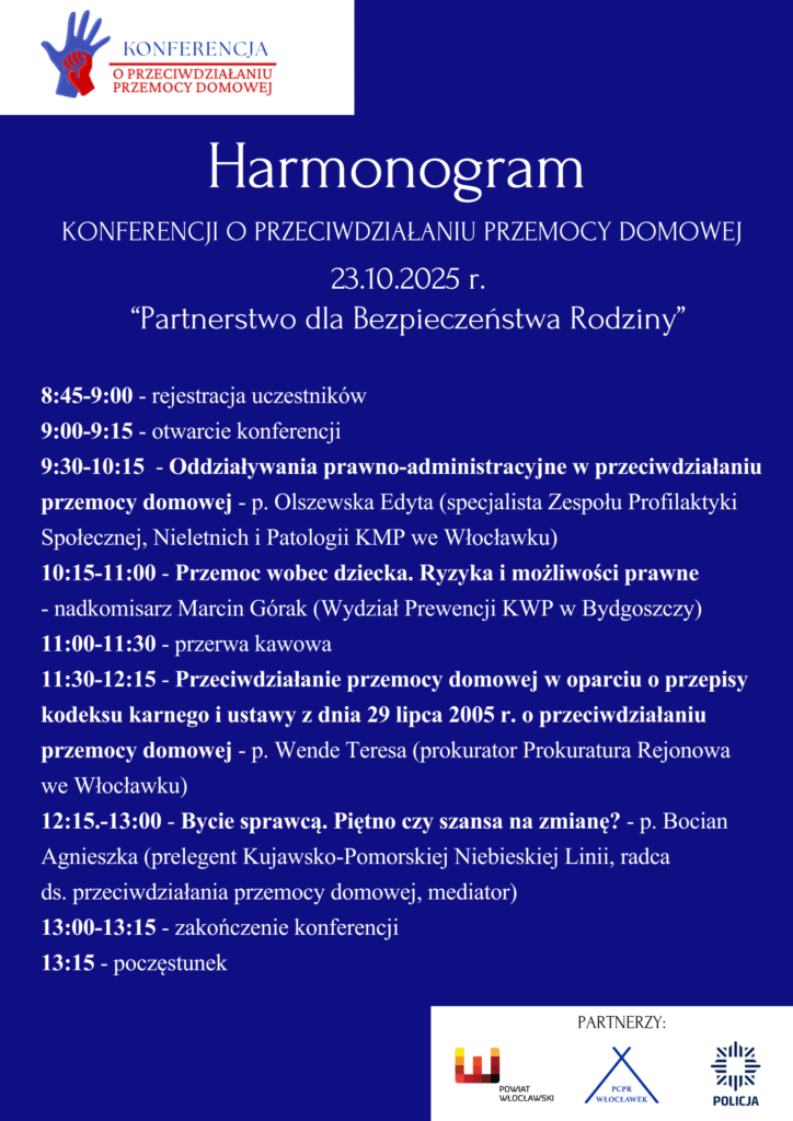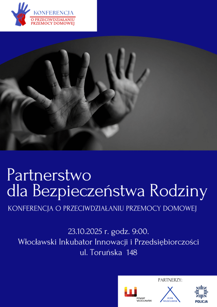 Miło nam poinformować, że Powiatowe Centrum Pomocy Rodzinie we Włocławku wraz z Komendą Miejską Policji we Włocławku organizuje w dniu 23.10.2025 r. we Włocławskim Inkubatorze Innowacji i Przedsiębiorczości – konferencję o przeciwdziałaniu przemocy domowej, pn. „Partnerstwo dla Bezpieczeństwa Rodziny”. Konferencja została objęta patronatem Starosty Włocławskiego – Pana Romana Gołębiewskiego oraz Komendanta Miejskiego Policji we Włocławku – Pana nadkomisarza Arkadiusza Góreckiego.